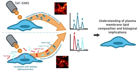 The plasma membrane in neurons is a highly organized and dynamic structure supporting cellular shape and structures (e.g., movement, budding, cell division, tubulation, synapses, axons, and dendrites), intracellular trafficking, extra-and intracellular signaling, exo- and endocytosis, protein interactions, vesicular trafficking, and cell differentiation, etc. [11,12]. To maintain cellular function, the lipid composition of the plasma membrane is dynamically adapted and renewed via a turnover process, in which old lipid molecules are replaced by newly synthesized ones. Different types of lipids and their relative compositions have significant effects during cell differentiation, cell signaling, and intracellular processes [4,12,13,14,15,16]. The composition and turnover of plasma membrane lipids were found to be altered in the aforementioned diseases, which implies that they are closely related to the cell status and neuronal activity [17,18,19,20,21,22,23,24,25,26,27,28,29,30,30,31,32].