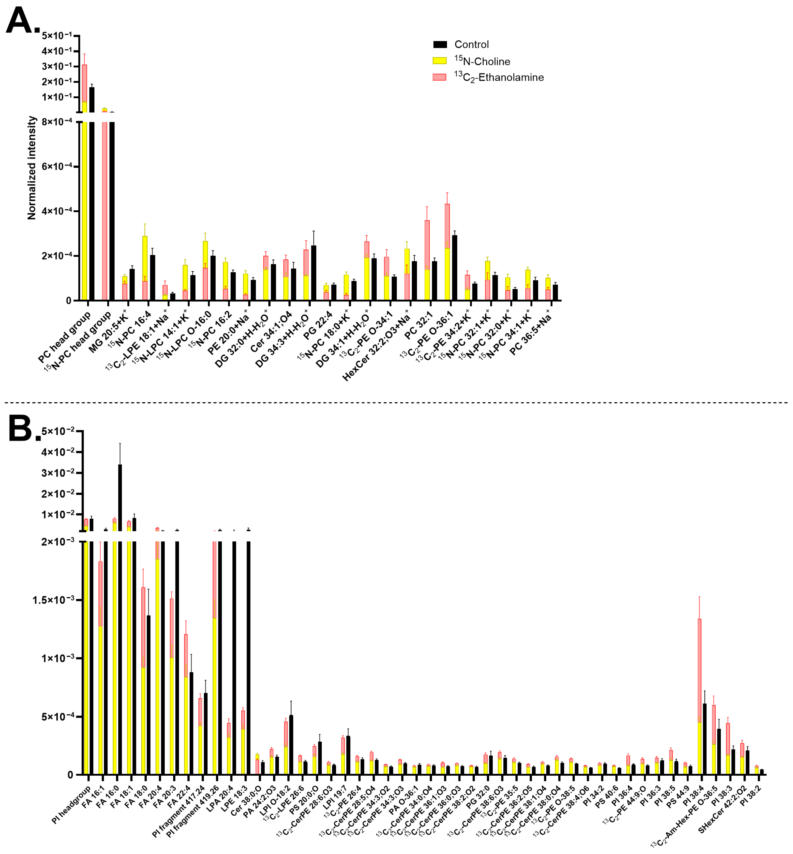 Figure 2. Major lipids with significantly different turnover in human midbrain neurons following 13C2-ethanolamine or 15N-choline incubation. (A) Lipids detected in positive mode and (B) lipids detected in negative mode. The 13C2-ethanolamine (pink) and 15N-choline (yellow) bars are superimposed, and the control (black) is interleaved. Lipids are arranged in each chart from left to right in ascending mass/charge (m/z). Error bars represent standard error of mean (SEM). The data of 13C2-ethanolamine and 15N-choline are significantly different from each other by a multiple Mann–Whitney test with a p-value of ≤0.05. Cells treated with either 15N-choline or 13C2-ethanolamine each had two biological replicates with seven to nine measurements per ion mode. The control had five biological replicates with 20 measurements per ion mode. 1-(1Z-alkenyl),2-acylglycerophosphoethanolamine glycan (Am-Hex-PE), ceramide (Cer), ceramide phosphoethanolamine (CerPE), diacylglycerol (DG), fatty acid (FA), hexosylceramide (HexCer), lysophosphatidic acid (LPA), lysohosphatidylcholine (LPC), lysophosphatidylethanolamine (LPE), lysophosphatidylinositol (LPI), monoacylglycerol (MG), phosphatidic acid (PA), phosphatidylcholine (PC), phosphatidylethanolamine (PE), phosphatidylglycerol (PG), phosphatidylinositol (PI), phosphatidylserine (PS), and sulfatide (SHexCer). Lipids with no annotated ionization were detected as [M+H]+ in (A) and [M–H] in (B).