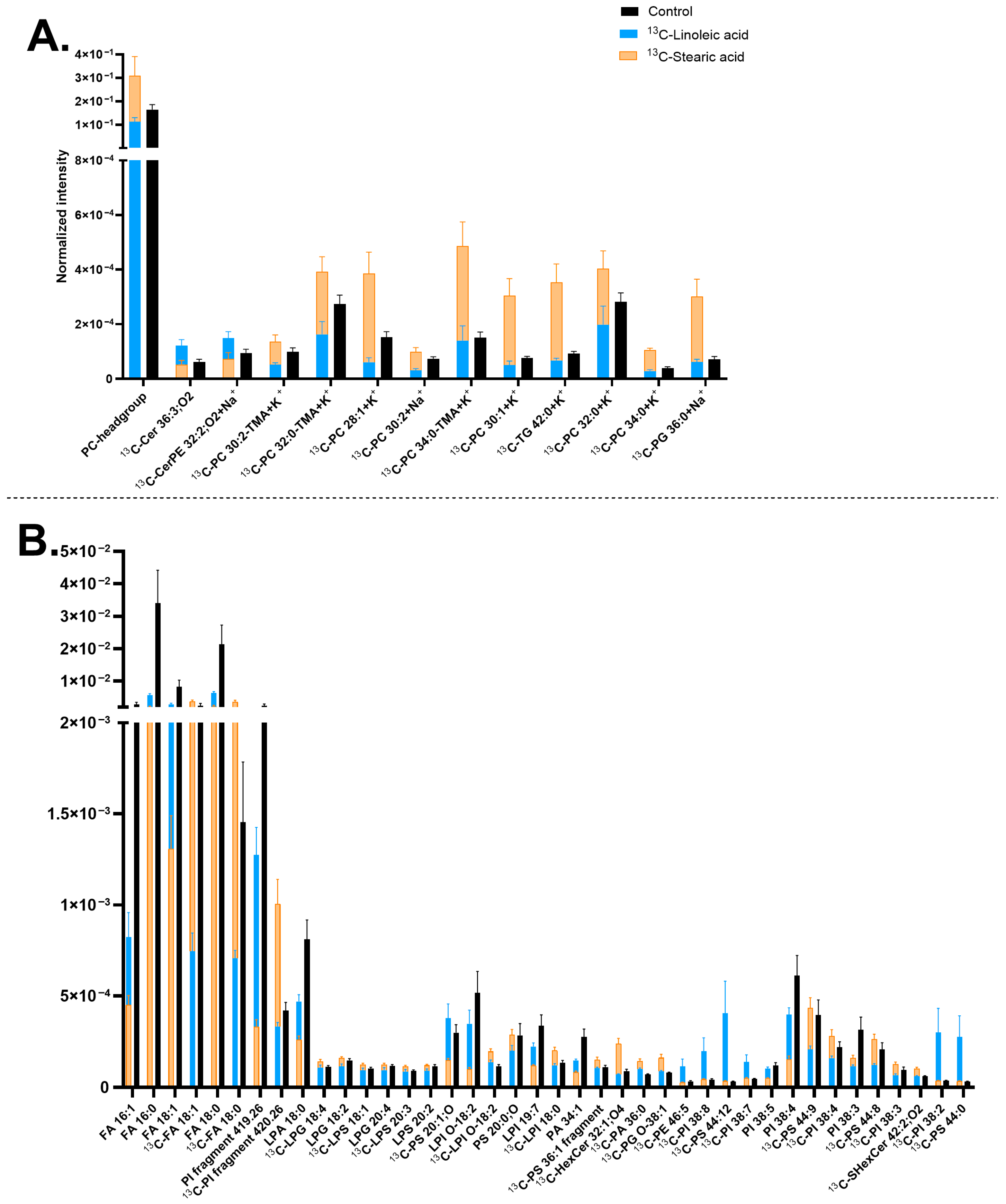 In relation to Figure 3, which compares 13C-linolenic acid and 13C-linoleic acid, some lipids were common, such as [13C-LPA 16:1-H] at m/z 408.22, having higher abundance with 13C-linolenic acid (Figure 3B and Figure 5B). On the other hand, [13C-PI 38:4-H] at m/z 886.55 and [13C-PS 44:8-H] at m/z 887.56 showed higher abundance with 13C-stearic acid. In addition, comparing Figure 4 and Figure 5, similar lipids were observed, for example, [FA 16:0-H] at m/z 255.23 with lower abundance, whereas [13C-FA 18:1-H] at m/z 282.25, [13C-FA 18:0-H] at m/z 284.26, and PCs having higher abundance with 13C-stearic acid.