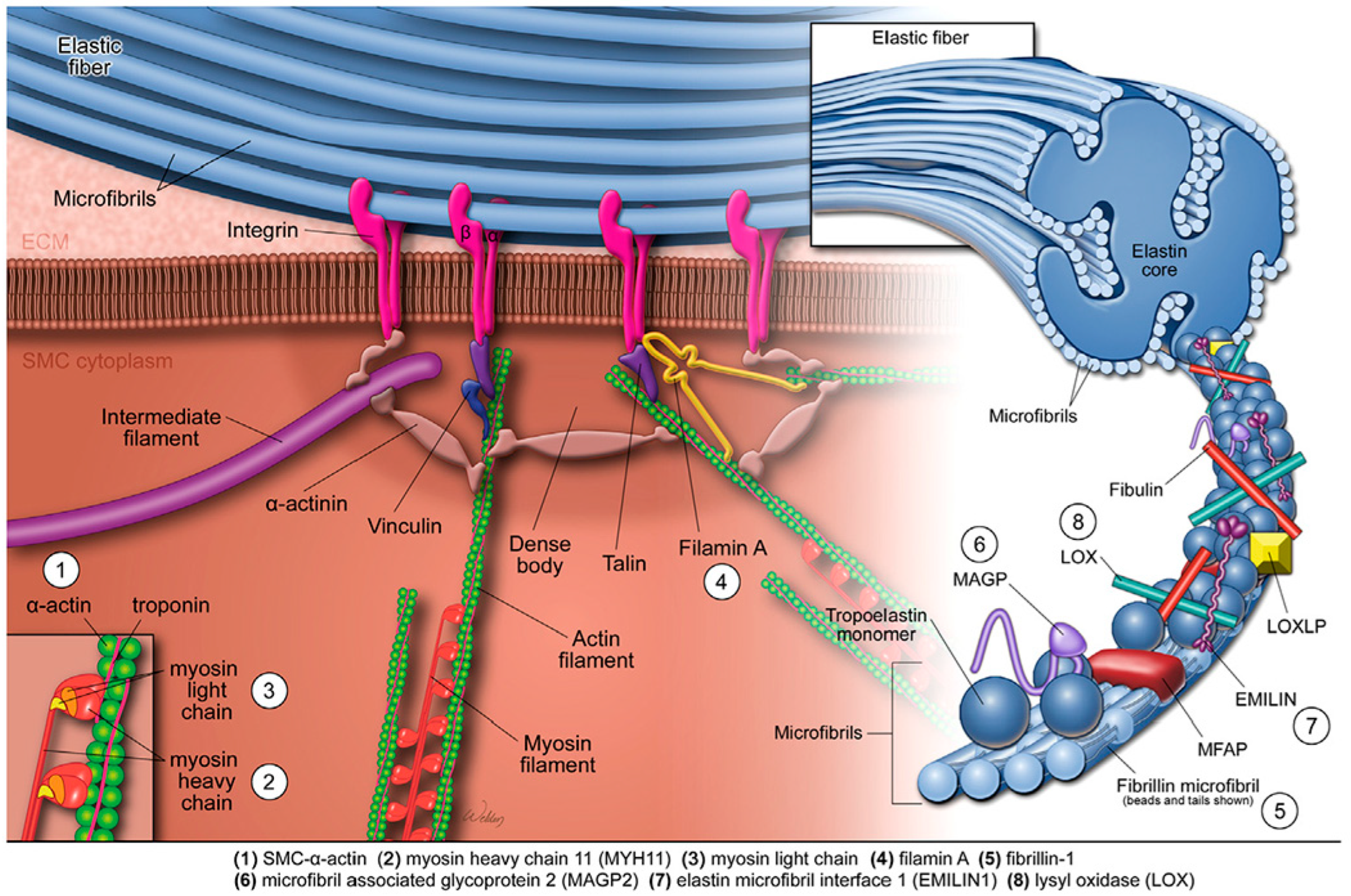 Figure 1. The elastin–contractile unit and mutations affecting aortic contractile function. The elastin–contractile unit is a specialised configuration composed of elastic fibres, focal adhesions (or dense plaques) in the plasma membrane, and contractile filaments within SMCs. Elastic fibres consist of a central elastin core surrounded by microfibrils composed of fibrillin, MAGPs, EMILIN1, fibulins, and other glycoproteins. The SMC contractile apparatus includes actin-containing thin filaments, myosin-containing thick filaments, and associated regulatory proteins. Mechanical stimuli are transmitted from the elastic fibre through membrane-bound focal adhesions, then via anchoring or actin-linking proteins to the contractile apparatus, ultimately triggering SMC contraction. Genetic thoracic aortic aneurysms and dissections are associated with mutations in genes encoding structural and regulatory components of the elastin–contractile unit. These include smooth-muscle α-actin (ACTA2), myosin heavy chain 11 (MYH11), myosin light chain kinase (MYLK), filamin A (FLNA), fibrillin-1 (FBN1), MAGP2, EMILIN1, and lysyl oxidase (LOX). EMILIN1: elastin microfibril interfacer protein 1; MAGPs: microfibril-associated glycoproteins; SMCs: smooth-muscle cells. Reproduced from Shen and LeMaire [23] with permission from Elsevier.