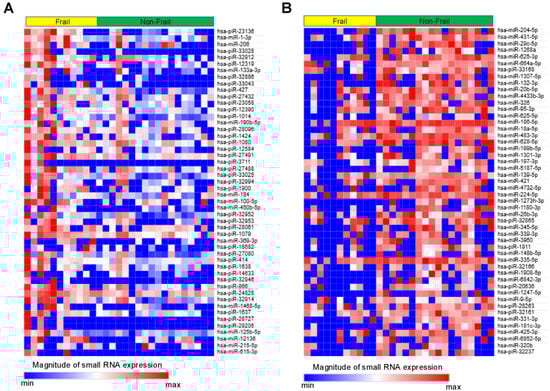 Heat map showing relative expression levels of small RNAs in the Frail vs. Non-Frail groups. (A) Top 50 small RNAs upregulated in Frail vs. Non-Frail groups. (B) Top 50 small RNAs downregulated in Frail vs. Non-Frail groups. A relative color scheme uses the minimum and maximum values in each row to convert values into colors.