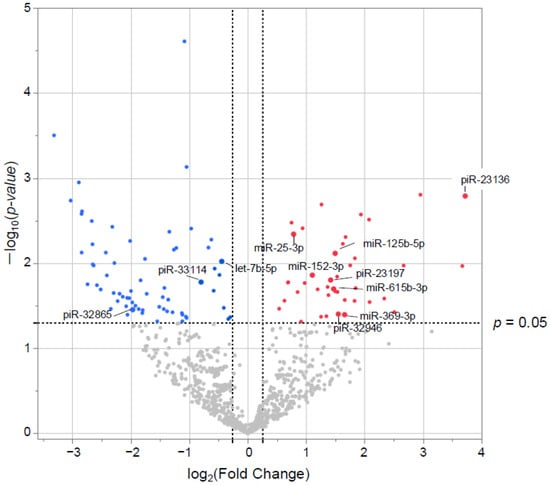 Differentially expressed (DE) small RNAs in volcano plots. The x-axis represents the log2 conversion of the fold-change values, whereas the y-axis represents the significance level after log10 conversion. Blue (downregulated) and red (upregulated) dots indicate small RNAs with |log2 fold change| > 0.26 (vertical dashed lines) and p < 0.05 (horizontal dashed line).