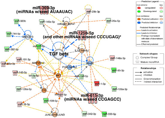 IPA of small RNA-seq data identified pathogenetic pathways contributing to frailty in patients with obstructive pulmonary disease. The highest-scoring network included TGF-β, collagen alpha-1, insulin, AKT, IL12, MAP2K1/2, PI3K, and SMAD2/3-related signals (Figure 4). Insulin downregulation was associated with the downregulation of TGF-β and PI3K, with upregulation of IL12, AKT, miR-125b-5p, miR-615-3p, and miR-1-3p. miR-125b-5p upregulation inhibited TGF-β, which correlated with collagen alpha-1 upregulation. Small RNAs significantly correlated with physical factors (miR-125b-5p, miR-369-3p, and miR-615-3p) were involved in a top network that included TGF beta. Other than network analysis, top 20 analysis-ready molecules (upregulated top 10 and downregulated top 10) were selected (Table S4).