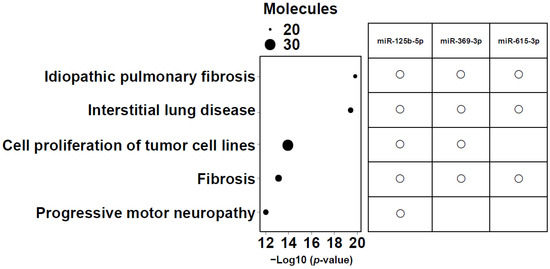 Enrichment ratio (size of the circle) and p-values for the 5 most enriched diseases and functions. The top five diseases and biofunctions that met the conditions of −log10 (p value) > 11, and molecules > 20 are shown. The size of the bubbles corresponds to the number of miRNAs involved in each category. The right panel shows a matrix indicating which candidate microRNAs (miR-125b-5p, miR-369-3p, and miR-615-3p) are associated with each of the listed diseases or biofunctions.