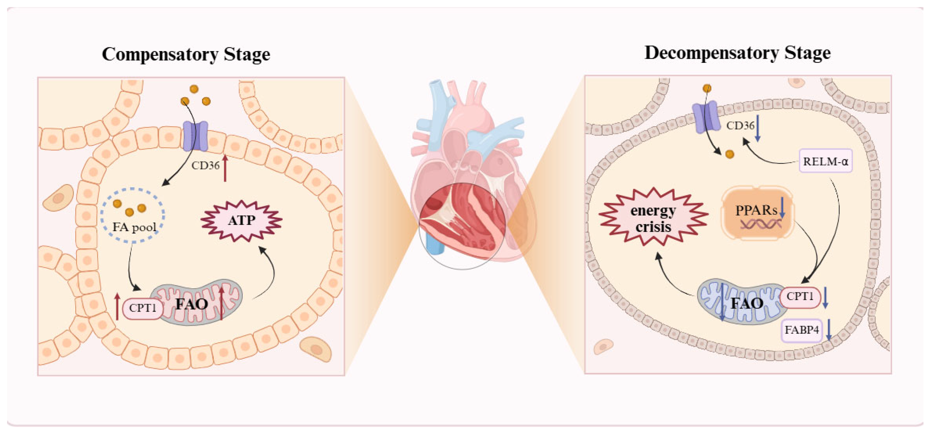 | Right Ventricular Cardiomyocytes | Bidirectional FAO Dysregulation: upregulation in compensatory stage; Decompensated stage: FAO downregulation, lipid deposition. |