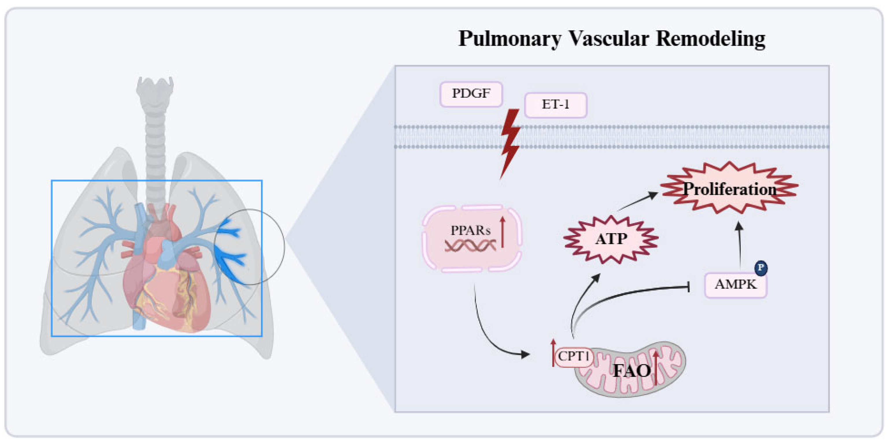 | Pulmonary artery smooth muscle cells | Markedly enhanced fatty acid uptake and FAO, providing energy and biomass for proliferation. | Aberrant proliferation, migration, and apoptosis resistance, driving vascular remodeling. | ↑CD36, CPT1A, ACSL1 | HIF-1α/PI3K, PPARγ/CPT1 |