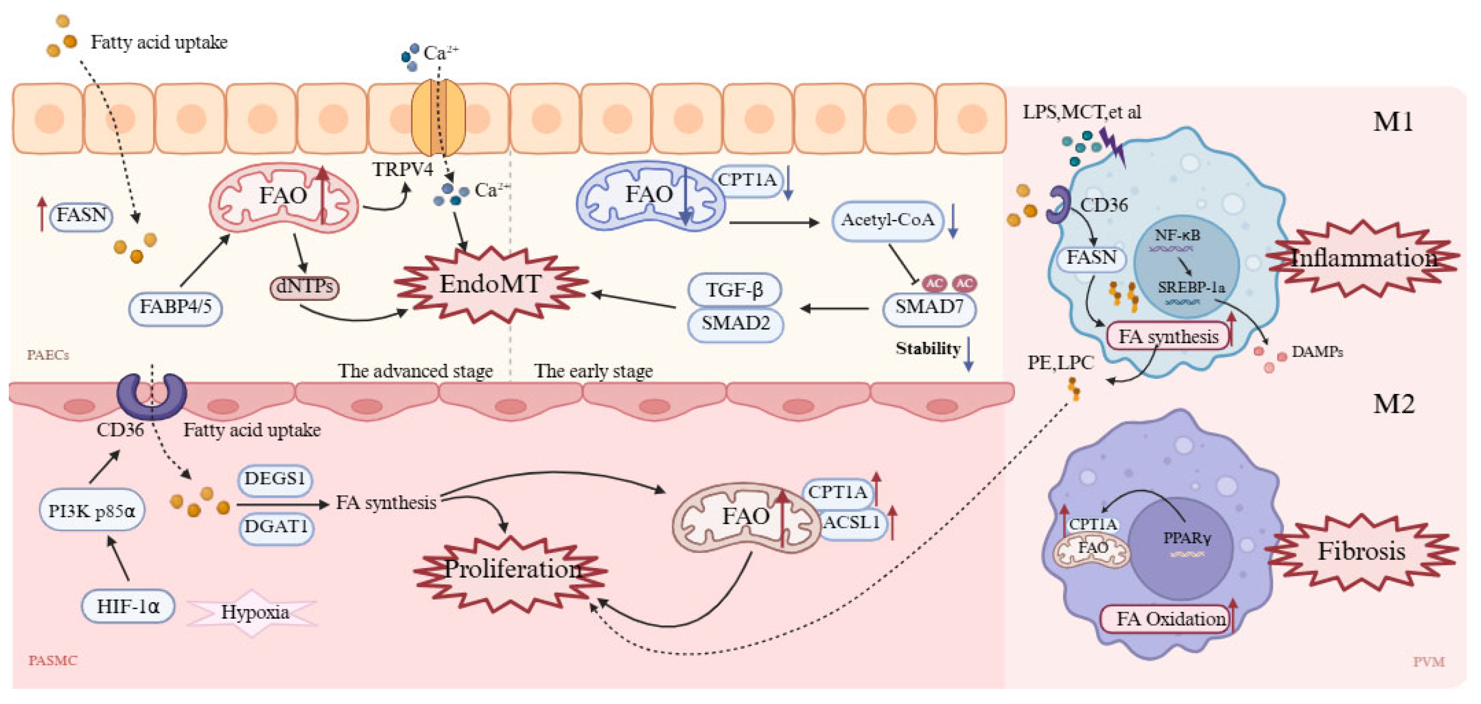 | Pulmonary Vascular Macrophages | M1 (Pro-inflammatory): Increased fatty acid synthesis and lipid droplet storage. M2 (Anti-inflammatory): Enhanced FAO supporting oxidative phosphorylation. | M1: Drives inflammation, promotes PASMC proliferation. M2: Anti-inflammatory, tissue repair, but excessive activation exacerbates fibrosis | M1: ↑CD36, FASN M2: ↑CPT1A | NF-κB/SREBP-1a |