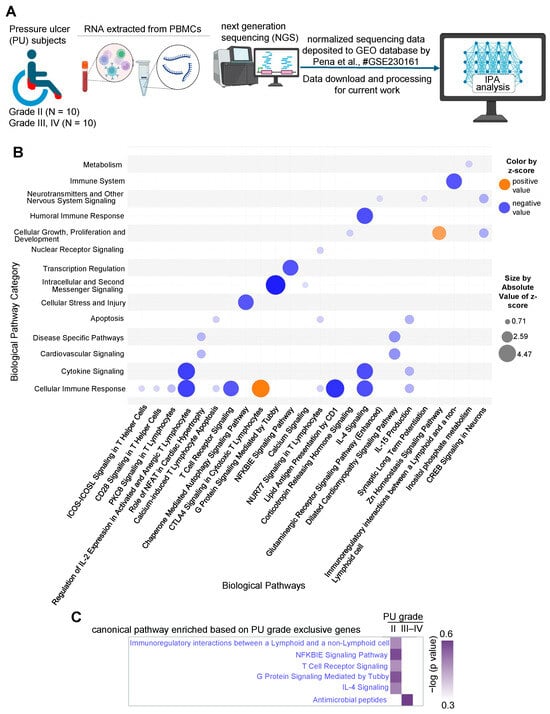 (A) Schematic diagram showing the layout of the transcriptomics study conducted from the dataset deposited in the GEO database under accession number GSE230161 [26]. Created in BioRender. Ingenuity Pathway Analysis (IPA) was performed to investigate enriched pathways and upstream regulators based on the differentially expressed genes. (B) Bubble chart created with IPA software representing the significant biological pathways (x-axis) and their broad categories (y-axis) enriched by the differentially expressed genes in severe PU (grades III–IV) as compared to grade II PU. The intensity of the color represents the magnitude of pathway being up- or down-regulated. (C) Comparison analysis of T cell communication-related pathways enriched in A in differentially expressed genes exclusively present in either severe PU or grade II PU using the comparison analysis function of IPA.