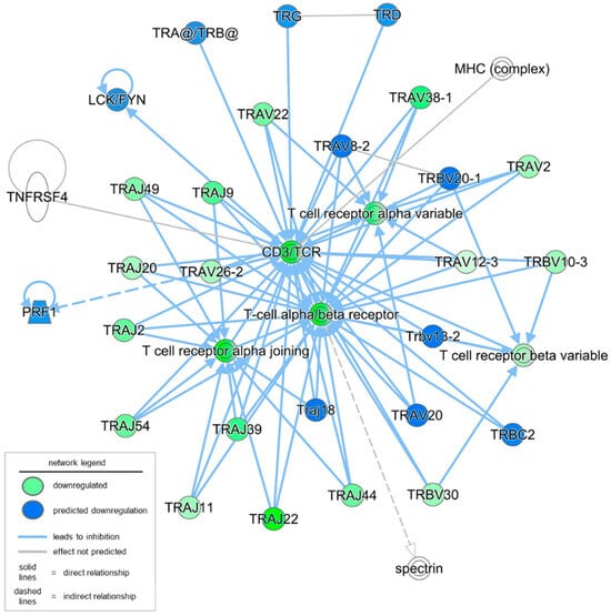 To better understand the observed and predicted effector molecules involved in the defective T cell signaling in severe PU, a network analysis of immunological disease and cellular compromise functions was performed. The resulting network yielded a score of 27 with 16 downregulated genes and their fold changes in severe PU (Figure 2, Table 2). This included T cell receptor isoforms of variable (e.g., TRAVs/TRBVs), constant (e.g., TRBCs), and joining (e.g., TRAJs) segments (Figure 2, Table 2). Based on the expression levels of the above 16 focus molecules, an additional 19 molecules and relationships were predicted through IPA analysis (Figure 2, Table 2). In addition to predicted genes such as perforin 1 and T cell receptor-related genes, these included groups and complexes such as CD3/TCR, LCK/FYN, MHC, T cell receptors, TRA/TRB, and spectrin (Figure 2, Table 2). Disease and functional annotation of these 35 (16 observed and 19 predicted) molecules and relationships with respect to T lymphocyte function predicted their association with quantity, morphology, activation, and lack of T lymphocytes in severe PU subjects (Table 3).