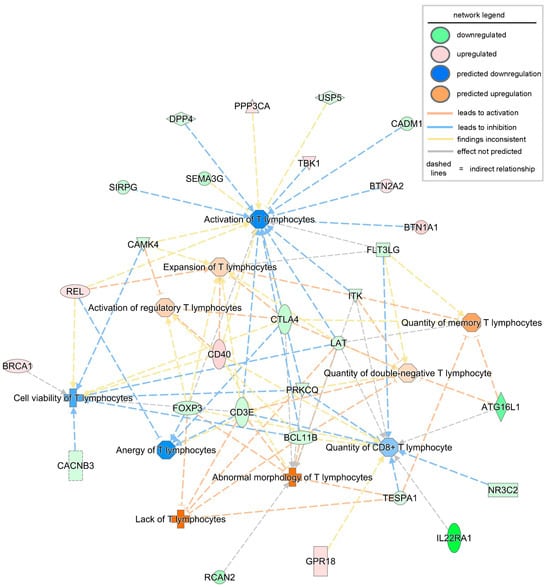 Disease or biofunction analysis related to T lymphocytes using IPA based on the observed and predicted differentially expressed genes and complexes in severe PU. The intensity of the color represents the magnitude of genes or pathways being up- or down-regulated.