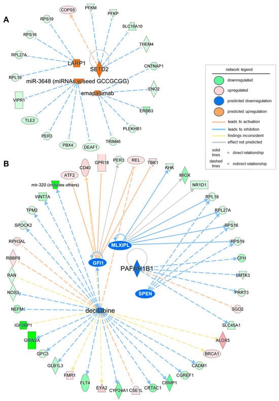 Finally, to design future therapeutics based on the significant DEGs in severe PU, it is essential to identify the activated and inhibited upstream regulators, including drugs, transcription/translation regulators, enzymes, or microRNAs. Using the upstream analysis function in IPA, a list of significant upstream regulators (activation z-score > ±2, p-value < 0.05) was obtained, including both activated and inhibited regulators (Table 5). Targets of the translation regulator LARP1, enzyme SETD2, microRNA miR-3648, and the biological drug emapalumab were found to be differentially expressed in severe PU (Figure 4, Table 5). On the contrary, transcriptional regulators GFU1, SPEN, and MLXIPL, the enzyme PAFAH1B1, and the chemical drug decitabine, were found to be activated based on their target genes in the severe PU subjects (Figure 4, Table 5). Among the abovementioned activated and inhibited upstream regulators, decitabine was found to target the most significant number of genes in the datasets, and 19 of 26 genes showed measurement direction consistent with decitabine inhibition.