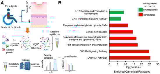 (A) Schematic diagram showing the layout of the proteomic study conducted by Baldan-Martin et al., 2020 [27]. Created in BioRender. Differentially expressed proteins identified by tandem mass tag (TMT) labeling in severe PU (grade III–IV) pressure ulcer tissue (n = 6) and control tissue (n = 6). (B) Bar chart created from IPA software output representing the significant canonical pathways using a strict criterion [activation z-score > ±3; −log(p-value) > 7].