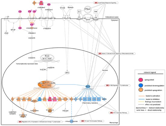 Network analysis of upregulated LXR/RXR activation signaling as revealed by IPA analysis in the proteomic study conducted by Baldan-Martin et al., 2020 [27]. The intensity of the color represents the magnitude of molecules or processes being up- or down-regulated. CP = Canonical Pathways.