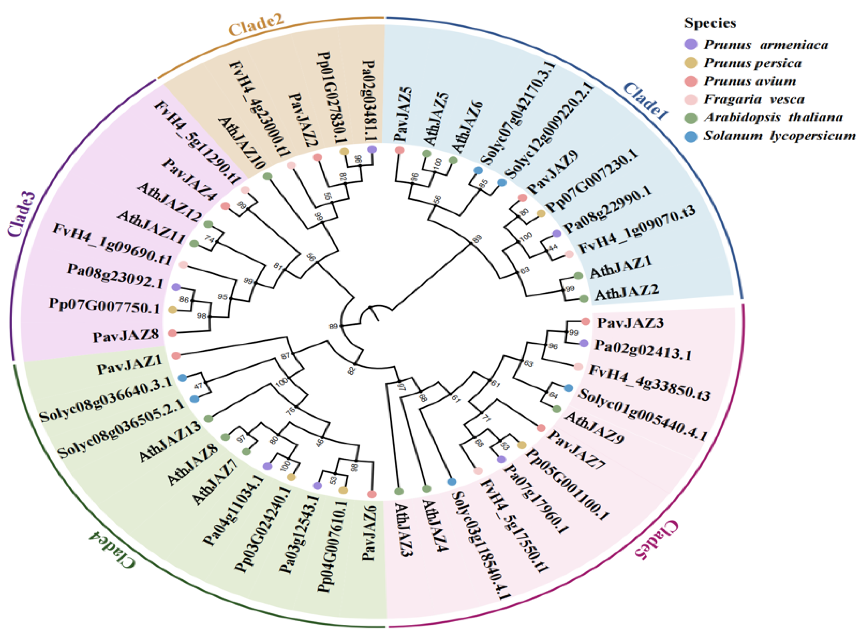 2.2. Identification and Classification of JAZ Gene Family in Sweet Cherry