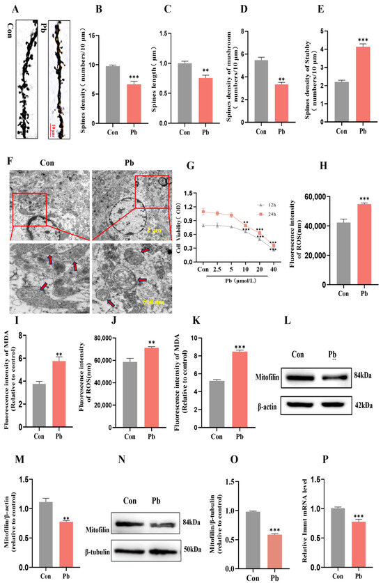 The effects of chronic lead exposure on neuronal dendritic spine plasticity and mitochondrial structure and function. (A) Golgi staining was employed to examine alterations in neuronal dendritic spines within the CA1 region of the hippocampus in mice subjected to chronic lead exposure. (B) The density of neuronal dendritic spines in the hippocampal CA1 region was subjected to statistical analysis. (C) The length of dendritic spines in neurons of the hippocampal CA1 region was statistically analyzed. (D) The density of mushroom-type neuronal dendritic spines in the CA1 region of the hippocampus was statistically analyzed. (E) The density of stubby dendritic spines in neurons of the hippocampal CA1 region was statistically analyzed. (F) The mitochondrial structure of neurons in the CA1 region of the hippocampus was examined using transmission electron microscopy following chronic lead exposure (The red arrows indicate mitochondria; The red square indicates local magnification). (G) The effect of lead exposure on HT22 cell viability was determined by MTT. (H) Alterations in reactive oxygen species (ROS) levels in HT22 cells were assessed after chronic lead exposure. (I) Modifications in malondialdehyde (MDA) levels in HT22 cells were evaluated following chronic lead exposure. (J) Alterations in reactive oxygen species (ROS) levels in the hippocampus were assessed after chronic lead exposure. (K) Modifications in malondialdehyde (MDA) levels in the hippocampus were evaluated following chronic lead exposure. (L) Western blot analysis was conducted to determine the expression of Mitofilin in HT22 cells after chronic lead exposure. (M) Gray-scale analysis was performed to quantify the expression level of Mitofilin in HT22 cells following chronic lead exposure. (N) Western blot analysis was conducted to determine the expression of Mitofilin in the hippocampus tissue after chronic lead exposure. (O) Gray-scale analysis was performed to quantify the expression level of Mitofilin in the hippocampus tissue following chronic lead exposure. (P) RT-qPCR was employed to measure the expression level of Immt mRNA in HT22 cells after chronic lead exposure. Data are presented as the mean ± SEM (n = 5). ** p < 0.01 vs. Con; *** p < 0.001 vs. Con. Western blot original images are in the Supplementary Materials.