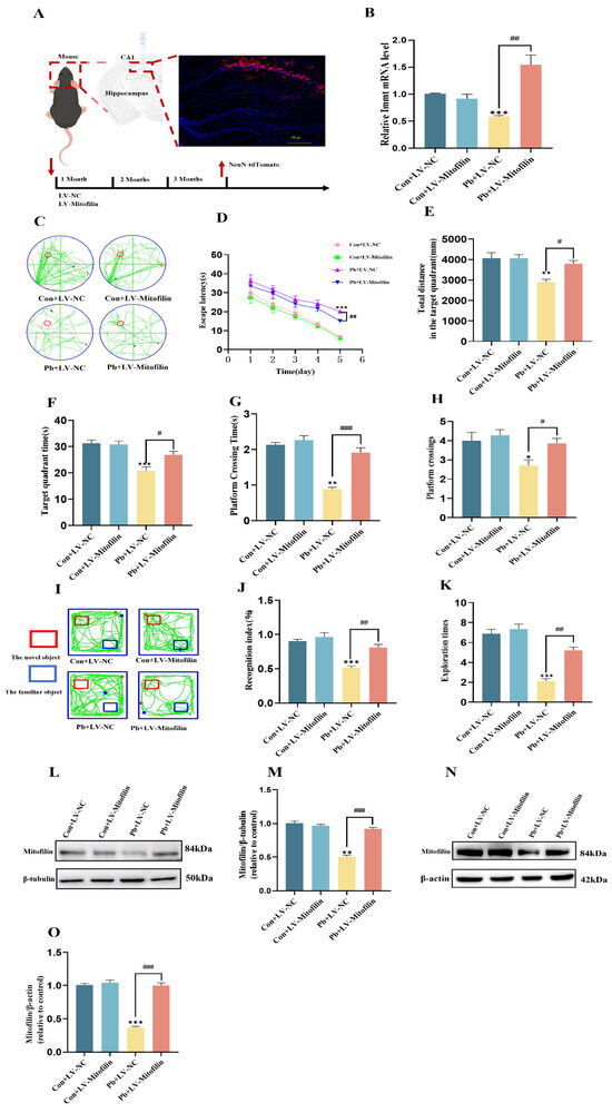 Overexpression of Mitofilin improves learning and memory in mice by affecting the expression of Mitofilin after chronic lead exposure. (A) Stereotaxic injection of AAV-SYN- tdTomato-P2A-Mitofilin virus into the mouse brain to create a model map. (B) Statistical analysis of mRNA expression levels in the hippocampus of mice following Immt expression, as detected by RT-qPCR. (C) Assessment of the water maze test trajectories in mice post-Mitofilin overexpression(The green line represents the animal trajectory, and the red circle represents the location of the water maze experiment platform.). (D) Statistical analysis of the escape latency period following Mitofilin overexpression. (E) Statistical evaluation of the total distance covered in the target quadrant after Mitofilin overexpression. (F) Statistical analysis of the duration spent in the target quadrant following Mitofilin overexpression. (G) The duration of Mitofilin overexpression was subjected to statistical analysis. (H) Statistical analysis was conducted on the frequency of platform crossings following Mitofilin overexpression. (I) An experimental track map was generated to assess the interaction with new objects in mice post-Mitofilin overexpression(The red square represents the new object position). (J) The cognitive index related to new objects following Mitofilin overexpression underwent statistical evaluation. (K) The frequency of new object exploration subsequent to Mitofilin overexpression was analyzed statistically. (L) Western blot analysis was conducted to determine the expression of overexpressing Mitofilin in HT22 cells after chronic lead exposure. (M) Gray-scale analysis was performed to quantify the expression level of overexpressing Mitofilin in HT22 cells following chronic lead exposure. (N) Western blot analysis was conducted to determine the expression of overexpressing Mitofilin in hippocampus tissue after chronic lead exposure. (O) Gray-scale analysis was performed to quantify the expression level of overexpressing Mitofilin in hippocampus tissue following chronic lead exposure. Data are presented as the mean ± SEM (n = 8). * p < 0.05 vs. Con+LV−NC; ** p < 0.01 vs. Con+LV−NC; *** p < 0.001 vs. Con+LV−NC; # p < 0.05 vs. Pb+LV−NC; ## p < 0.01 vs. Pb+LV−NC; ### p < 0.001 vs. Pb+LV−NC. Western blot original images are in the Supplementary Materials.
