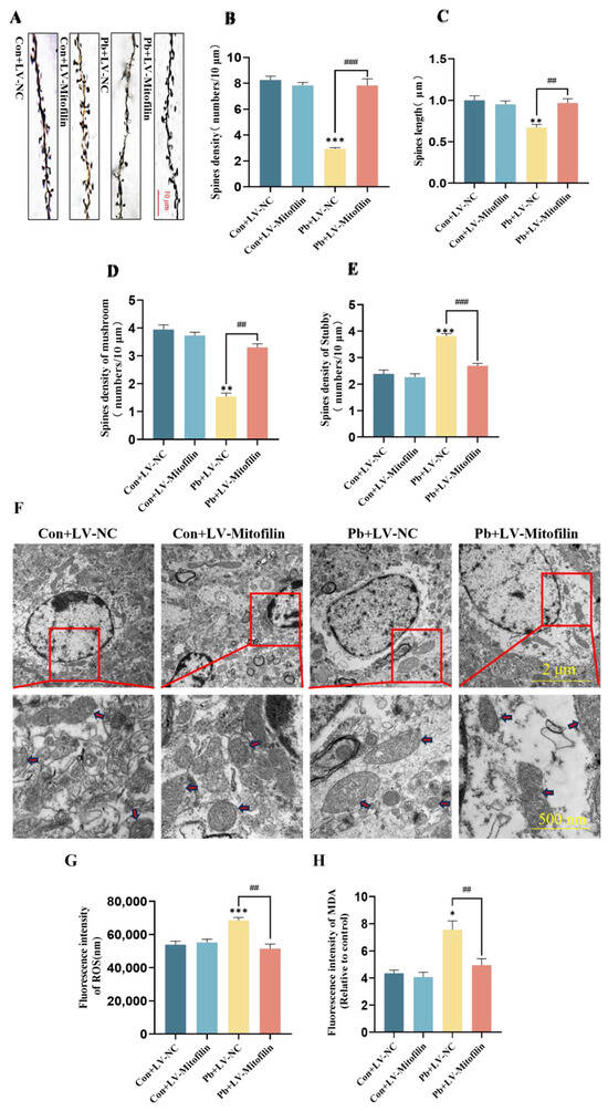 Mitofilin overexpression protects neuronal dendritic spine plasticity damage after lead exposure by improving mitochondrial structural integrity. (A) Alterations in neuronal dendritic spines were examined using Golgi staining. (B) A statistical analysis was performed on the dendritic spine density of neurons within the CA1 region of the hippocampus. (C) A statistical analysis was conducted on the length of neuronal dendritic spines in the CA1 region of the hippocampus. (D) A statistical analysis was carried out on the density of mushroom-shaped dendritic spines in the CA1 region of the hippocampus. (E) A statistical analysis was conducted on the density of stubby dendritic spines in the CA1 region of the hippocampus following the overexpression of Mitofilin. (F) The mitochondrial architecture of neurons in the CA1 region of the hippocampus was examined using transmission electron microscopy subsequent to Mitofilin overexpression (The red arrows indicate mitochondria; The red square indicates local magnification). (G) Alterations in reactive oxygen species (ROS) levels in HT22 cells were assessed following Mitofilin overexpression. (H) Modifications in malondialdehyde (MDA) levels in HT22 cells were evaluated after the overexpression of Mitofilin. Data are presented as the mean ± SEM (n = 4). * p < 0.05 vs. Con; ** p < 0.01 vs. Con; *** p < 0.001 vs. Con; ## p < 0.01 vs. Pb+LV−NC; ### p < 0.001 vs. Pb+LV−NC.