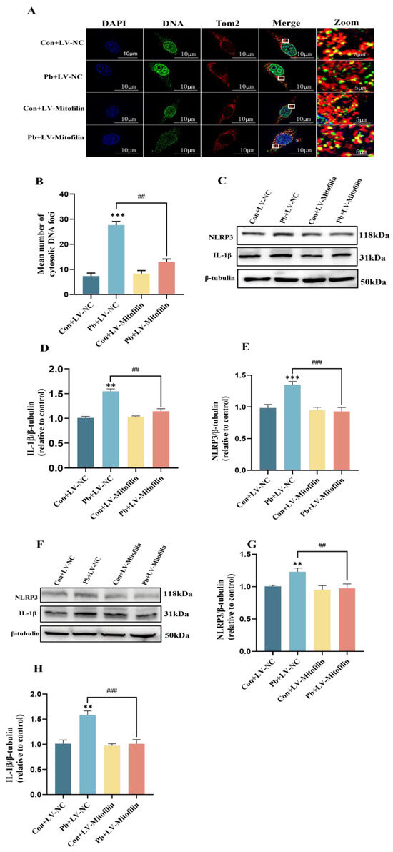 Inhibition of the release of mtDNA by mitofilin overexpression diminishes the resultant damage to neurons. (A) The release of mtDNA from neurons following the overexpression of Mitofilin was examined using cellular immunofluorescence staining. (B) Quantitative analyses were conducted to assess the alterations in mtDNA release in neurons post-Mitofilin overexpression. (C) The expression levels of Nlrp3 and IL-1β in HT22 cells subsequent to Mitofilin overexpression were determined via Western blot analysis. (D,E) The expression level of IL-1β in HT22 cells was evaluated through gray-scale analysis, as was the expression level of Nlrp3. (F) The expression levels of Nlrp3 and IL-1β in the hippocampus tissue subsequent to Mitofilin overexpression were determined via Western blot analysis. (G,H) The expression level of IL-1β in the hippocampus tissue was evaluated through gray-scale analysis, as was the expression level of Nlrp3. Data are presented as the mean ± SEM (n = 4). ** p < 0.01 vs. Con; *** p < 0.001 vs. Con; ## p < 0.01 vs. Pb+LV−NC; ### p < 0.001 vs. Pb+LV−NC. Western blot original images are in the Supplementary Materials.