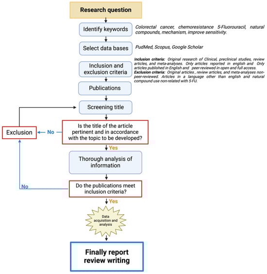This is a narrative review structured as shown in Figure 1. First, the keywords related to the research question were identified, and recognized databases were utilized for the search (PubMed, Scopus, and Google Scholar). The inclusion criteria focused on all the works on colorectal cancer treatment and natural compounds and excluded the articles that did not have experimental validation and relation to colorectal cancer treatment with 5-Fluorouracil (5-FU). All the publications selected were thoroughly analyzed in their full-text forms to ensure alignment with the inclusion criteria. This system allowed for the development of the following topics of the review.
