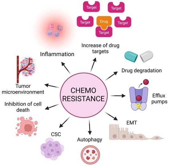 Main mechanisms and alterations in tumors that lead to evasion of cell death and, consequently, chemoresistance and tumor relapse. Inflammation, increment of drug targets, alteration in functions of efflux pumps, acquisition of epithelial–mesenchymal transition (EMT) markers, autophagy, presence of cancer stem cells (CSCs), increment of anti-apoptotic proteins, and tumor microenvironment.