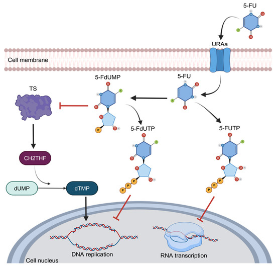 One of the main features of 5-FU is its functioning as an analog of uracil with a fluorine atom bound at the C-5 position in place of hydrogen that favors cell entry through the exact same facilitated transport mechanism as uracil [26]. Once inside the cells, this compound is converted to 5-fluorodeoxyuridine monophosphate (FdUMP), a potent thymidylate synthase (TS) inhibitor. TS is the main enzyme required for DNA replication, acting as a dimer. It contains a nucleotide-binding site for 5,10-methylenetetrahydrofolate (CH2THF) as the methyl donor necessary for the conversion of deoxyuridine monophosphate (dUMP) to deoxythymidine monophosphate (dTMP), supplying the sole de novo source of thymidylate, which is required for DNA replication and repair [15]. This interaction of 5-FU and TS is performed when FdUMP binds to the nucleotide-binding site of TS, forming a ternary complex with the enzyme and CH2THF, thus blocking the binding site of the normal substrate dUMP and blocking dTMP synthesis and DNA replication [27] (Figure 3). Therefore, the alteration and increase in TS expression or mutation in this protein that disables the binding of FdUMP are the most well-established mechanisms of chemoresistance to 5-FU and imply poor prognosis in cancer patients [28]. As observed in breast and prostate cancer patients, the high expression of TS has been associated with a poor prognosis and survival [29,30]. In primary stomach adenocarcinoma, the expression of TS was associated with poor response and survival in patients who received 5-FU as a therapy [31,32]. In CRC, the main neoplasia treated with 5-FU, the landscape is too similar, and the high expression of TS is frequently observed in refractory patients to 5-FU treatment; in contrast, diminished TS expression correlates with a better response to chemotherapeutic treatments [32]. Indeed, when TS is found in low concentrations, CRC patients have a higher 3-year survival rate [33]. On the other hand, when TS is overexpressed, CRC patients usually do not respond to 5-FU-based schemes, such as the FOLFOX regimen (5-FU, oxaliplatin, and leucovorin) [34].