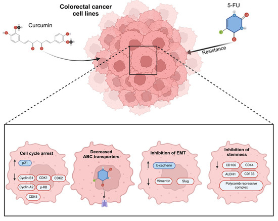 The main mechanisms of action related to the effect of curcumin in 5-Fluorouracil (5-FU) resistance colorectal cancer cells. Previous studies have verified the use of curcumin in 5-FU and its effects as regulator of cell cycle arrest, increasing P21 protein expression and the negative regulation of cyclin B1, cyclin-dependent kinases 1, 2, and 4 (CDK1, CDK2, CDK4), cyclin A2, and the phosphorylation of retinoblastoma, decreasing the expression of ABC transporters, regulating EMT markers such as E-cadherin positively, and reducing Vimentin and Slung proteins. Finally, curcumin has an important effect on regulating stemness markers such as CD116, CD44, ALDH1, CD33, and the polycomb repressive complex.