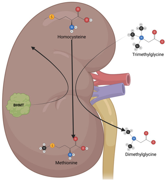 Trimethylglycine (TMG), or betaine, is a glycine-methyl derivative with a zwitterionic quaternary ammonium structure. It was first discovered in sugar beets (Beta vulgaris). It is also found in high quantities in spinach, wheat germ, wheat bran, and seafood, and is part of the metabolism of microorganisms, plants, and animals. TMG has two main physiological functions: the first is to act as an osmolyte to protect cells from stress conditions, and the second is to act as a methyl group donor [142]. In humans, TMG osmolyte function is mainly executed in the kidneys, which protects renal cells from high levels of urea and electrolytes. TMG acts as a methyl group donor mainly in the liver, where it helps to convert homocysteine to methionine via betaine–homocysteine methyl transferase (BHMT) (Figure 5) [143]. Besides its physiological functions, TMG has antioxidant and anti-inflammatory properties, making it a great option for cancer chemoprevention and cancer treatment in neoplasia with inflammatory components [144].