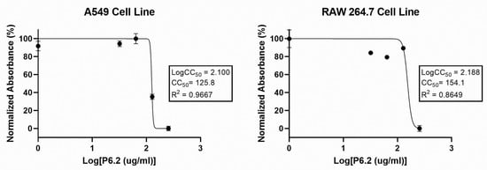 In order to assess the cytotoxic effect on eukaryotic cells, we tested different concentrations (8–256 µg/mL) of P6.2 in vitro against Raw 264.7, a murine macrophage cell line, and A549, the adenocarcinomic human alveolar basal epithelial cell line. The toxic effect of the peptide was evaluated indirectly by the MTT assay on these different cell lines (Figure 1).