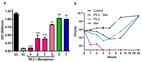 In the killing kinetic experiments, the drugs were evaluated at sub-MIC concentrations, alone or in combination (Figure 5B). Synergy is defined as a ≥2-log10 decrease in CFU/mL between the combination and its most active constituent, after 24 h, with the less active component being tested at an ineffective concentration. In addition, the bactericidal effect is considered when the treatment reduces the inoculum in three or more logarithmic units []. Figure 5B shows that P6.2 displays synergism with meropenem, both at a 0.5× MIC concentration, and also exhibited a bactericidal effect from 3 h forwards.