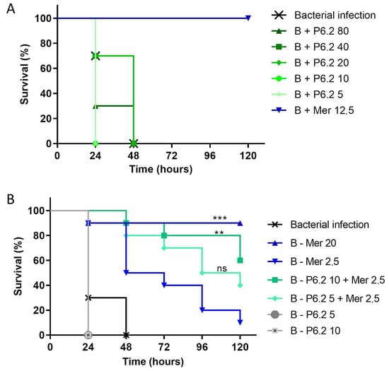 (A) In vivo evaluation of P6.2 alone against P. aeruginosa M13513. Larvae were infected with 10³ CFU/larva. One hour post infection, P6.2 was injected at 2.5, 10, 20, 40, and 80 mg/kg and meropenem at 12.5 mg/kg. (B) In vivo evaluation between P6.2 and meropenem against P. aeruginosa M13513. Larvae were infected as above. One hour after infection, peptide P6.2 or antibiotic was administered. B: bacteria; Mer: meropenem. The concentration of each compound is expressed en µg/mL. The data were graphed using the Kaplan–Meier method and comparisons between groups were made using the log rank test. Overall statistical significance was established at p < 0.05; and then the Log-rank (Mantel-Cox) test was performed between Mer 2.5 and Mer 2.5 + P6.2 10 ** p value = 0.0076, Mer 20 and Mer 2.5 *** p value = 0.0007, and Mer 2.5 and P6.2 5 + Mer 2.5, ns: not significative differences.