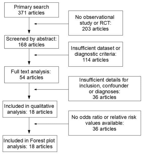 This selection resulted in 371 articles, which were then screened for relevance according to titles and abstracts. According to their abstracts, 203 publications did not directly report observational studies or RCT; in 114 articles, schizophrenia or psychosis had not been diagnosed according to ICD or DSM criteria, control groups were lacking, or data sets were incomplete, resulting in the exclusion of 317 articles. The full texts of the remaining 54 articles were downloaded and analyzed by at least two independent reviewers. In sum, 36 additional articles were excluded since the inclusion/exclusion criteria were not met, and/or confounders were not listed. From these eighteen studies, odds ratios from ten studies were included in the forest plot analysis, and eight studies were excluded because of major overlap with another study, a misfit of psychosis criteria or the lack of a control group (Figure 1).