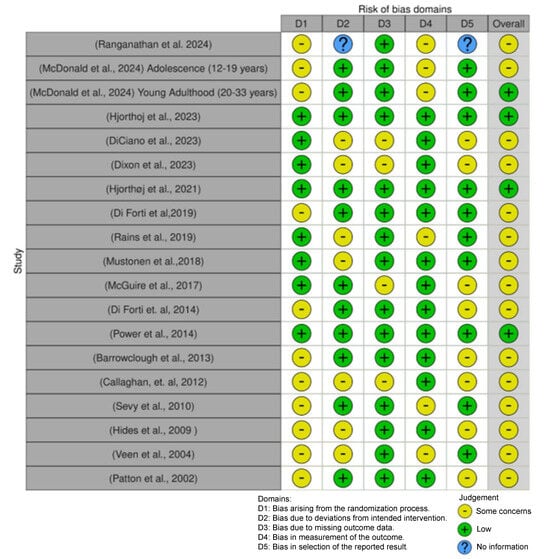 - Moore, T.H.M.; Higgins, J.P.T.; Dwan, K. Ten tips for successful assessment of risk of bias in randomized trials using the RoB 2 tool: Early lessons from Cochrane. Cochrane Evid. Synth. Methods 2023, 1, 12031. [Google Scholar] [CrossRef]