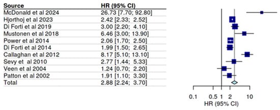 Forest plot for the association of psychosis/schizophrenia and cannabis use [25,26,27,28,29,30,31,32,33,38].