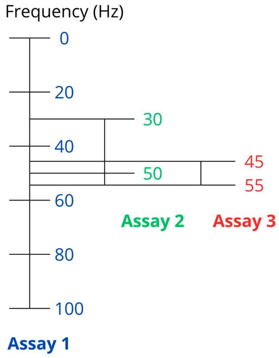 Graphical representation of the study of different frequency windows. Assay 1 evaluates the cell behavior in viability in a range of [20–100] Hz in 20 Hz ranges. In assay 2, the [20–60] Hz range is studied by reducing the step to 10 Hz. In assay 3, the range is determined at [40–60] Hz in 5 Hz steps.