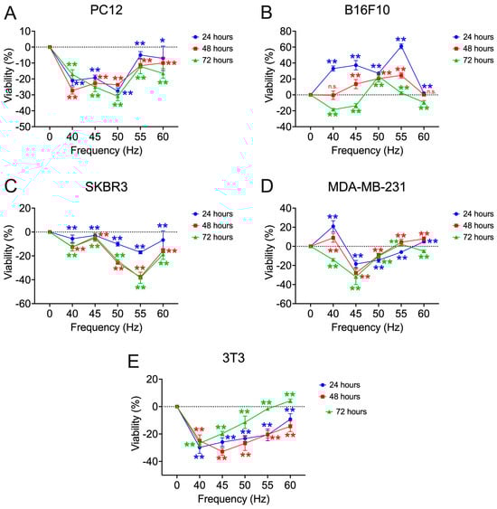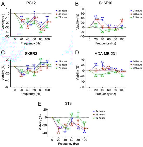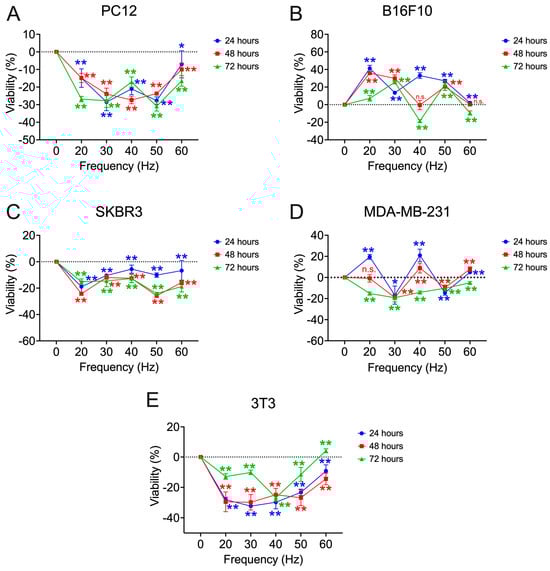Percentage of viability deviation obtained in the search of the first frequency window [20–100] Hz of the different cell lines tested with respect to non-exposure controls: (A) rat pheochromocytoma (PC12); (B) murine melanoma (B16F10); (C) HER2+ human breast cancer (SKBR3); (D) triple negative human breast cancer (MDA-MB-231); (E) murine fibroblasts (3T3). All assays are performed at a fixed intensity of 100 µT at 24, 48, and 72 h of exposure. Statistical results from application of the Student t-test or the Mann–Whitney statistical U test with a 95%-CI according to normality of the data: (*) p-value < 0.05; (**) p-value < 0.001; (n.s.) non-significant.