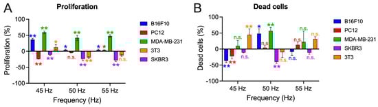 In relation to dead cells, as seen in Figure 9B, at 45 Hz, the B16F10 cells (−36.52 ± 5.68%; p = 0.001) and the pheochromocytoma cells (−22.27 ± 8.13%; p = 0.006) reduce statistically significantly. In the case of the 3T3 cells, this percentage increases compared to controls (44.78 ± 18.28%; p = 0.005). At 50 Hz, the percentage of dead cells in melanoma (48.15 ± 15.27%; p = 0.033) and MDA-MB-231 (56.94 ± 10.69%; p < 0.001) increase. This percentage is statistically significantly reduced for the SKBR3 cells (−40.22 ± 4.38%; p < 0.001). At 55 Hz none of the results is statistically significant.
