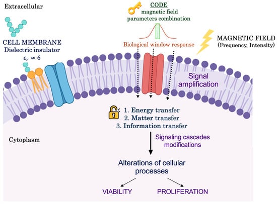 Hypothesis of interaction of the magnetic field and a cell. The cell receives the magnetic field stimulus as an encoding of exposure parameters that is in a bioactive range for a given cellular process. The first site of interaction is the cell membrane, where signal amplification occurs, resulting in a transfer of energy, matter, and information. This alters the cellular process through interaction with specific molecules of the cell signaling cascades. This leads to alteration of the basic cellular processes of viability and proliferation.