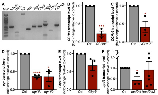 We first asked whether the fat bodies of adult females express adipokines known to have a role in larval development. Using RT-PCR, we detected transcripts for unpaired 2 (upd2); eiger (egr); stunted (sun); growth-blocking peptides 1, 2, and 3 (Gbp1, Gbp2, and Gbp3); CCHamide-1 (CCHa1); and CCHamide-2 (CCHa2) (Figure 1A). To determine whether these adipokines regulate oogenesis, we used the adipocyte-specific tubP-Gal80ts;3.1Lsp2-Gal4 driver (3.1Lsp2ts) [21] to express UAS-dsRNA transgenes targeting each adipokine for RNAi-mediated knockdown. Given that nutrient-sensing pathways like IIS and mTOR have been previously shown to function within the fat body to modulate oogenesis [21,23], we focused our analysis on CCHa1, CCHa2, egr, Gbp3, and upd2 based on their known roles in relaying nutrient status [35,38,39,40,41,42]. To determine knockdown efficiency, we used qRT-PCR to measure the transcript levels of each adipokine in adult female fat bodies from control and adipokine knockdown flies (Figure 1B–F). Compared to the controls, there was significant knockdown for all UAS-dsRNA transgenic lines: CCHa1 (76.7%) (Figure 1B), CCHa2 (58.4%) (Figure 1C), egr line 1 (egr#1—62.8%), egr line 2 (egr#2—63.2%) (Figure 1D), and upd2 line 1 (upd2 #1—56.3%) (Figure 1F). Two RNAi lines showed a moderate to slight reduction in transcript levels: Gbp3 (32.2%) (Figure 1E) and upd2 line 2 (upd2#2—7.7%) (Figure 1F). Of the six trials assessing the upd2 transcript level using the second UAS-dsRNA transgene, there were two outliers showing overexpression, thus dampening the effect of knockdown (Tables S2 and S3). Upon outlier exclusion, the upd2 transcript level using the second UAS-dsRNA transgene was reduced by 62.4%.