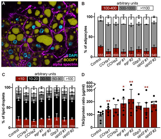 Based on previous work, changes in adipocyte size can be observed by feeding Drosophila a high-fat diet [46] and by knocking down certain proteins in the fat body [47]. We asked whether our subset of adipokine targets controls adipocyte cellular biology by using whole-mount adult fat body immunocytochemistry [48] to assess cell and lipid droplet size (Figure 2A). In the control and adipokine knockdown fat bodies, most adipocytes fall within the mid-range size (Figure 2B). While the average percentage of large adipocytes tends to be higher with CCHa1RNAi (18.5% ± 3.1), CCHa2 RNAi (17.7 ± 4.5), egr #1 RNAi#1 (18% ± 5.3), egr#2RNAi#1 (20.2% ± 5.3), Gbp3 RNAi (17.3% ± 3.6), upd2 RNAi#1 (18.8% ± 5.2), and upd2 RNAi#2 (14.2% ± 1.9) compared to the control (9.7% ± 3.4), there is no significant difference in average adipocyte size (Figure 2B and Table S4). Similarly, lipid droplet sizes, ranging from very small to very large, were comparable across the control and CCHa1, CCHa2, egr, Gbp3, and upd2 knockdown fat bodies (Figure 2C and Table S5). We also measured levels of triglycerides, the major form of stored fat in Drosophila adipocytes [49]. The adipocyte-specific knockdown of each adipokine resulted in higher TAG levels compared to the control, with CCHa1, egr, and upd2 knockdown showing statistically significant increases (1.7- to 2-fold change) (Figure 2D and Table S6). Taken together, these data suggest that the CCHa1, egr, and upd2 adipokines regulate lipid storage in adult female adipocytes.