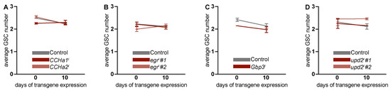 The genetic knockdown of amino acid receptors [21] and scavenger receptors [28] led to a reduction in the number of GSC in the germarium. Removing adipocyte-specific factors from the IIS and TOR signaling pathway has had detrimental effects on GSC maintenance and the process of vitellogenesis [21,23,24]. We asked whether CCHa1, CCHa2, egr, Gbp3, and upd2 in adult adipocytes control the ovarian GSC number. As observed in previous studies [21,23,24], the average GSC number declines slightly with age (Figure 3). Upon the RNAi-mediated knockdown of CCHa1, CCHa2, egr, Gbp3, and upd2 in adipocytes, the GSC loss associated with age was comparable to that of controls (Figure 3A–D and Table S7). Interestingly, we observed that the GSC number remained stable, i.e., it did not decrease with age, with CCHa1 and upd2 knockdown in adipocytes; however, there was no statistically significant difference compared to the controls (Figure 3A,D). Therefore, we conclude that CCHa1, CCHa2, egr, Gbp3, and upd2 originating from adipocytes do not support GSC maintenance.