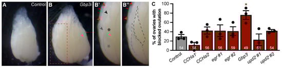 Individual ovarioles in adult Drosophila female ovaries contain only one or zero mature oocytes because of continual ovulation (Figure 5A), the last step of oogenesis that is sensitive to nutritional input [50]. Moreover, ovulation is regulated by mTOR signaling, the integrated stress response, and Ras/MAPK activity within adult adipocytes [21,24,25]. When single ovarioles retain more than one mature oocyte, ovulation is considered to be blocked [21] (Figure 5B,B′). To determine whether CCHa1, CCHa2, egr, Gbp3, or upd2 could mediate fat body control of ovulation, we quantified ovulation block in samples with the adipocyte-specific knockdown of each adipokine. For the knockdown of CCHa1, CCHa2, egr, and upd2, the percentage of ovaries with mature oocyte retention was comparable to that of the controls (Figure 5C). However, the adipocyte-specific knockdown of Gbp3 resulted in approximately a 45% increase in blocked ovulation compared to the controls (Figure 5A–C and Table S10). Thus, adipocyte-derived Gbp3 is required to promote ovulation.
