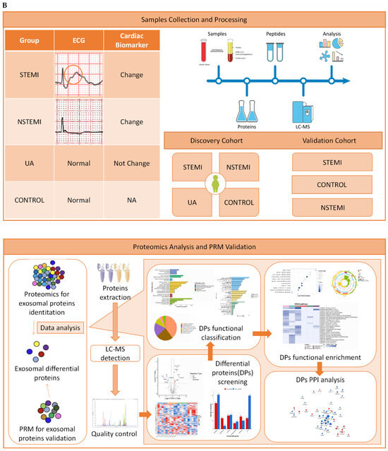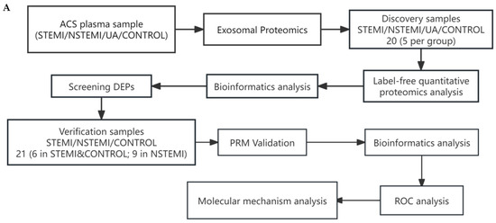 Brief flow chart (A) and workflow (B) for the proteomics study. Firstly, plasma samples were collected, and proteomics was used to identify exosomal differential proteins (DPs) in the STEMI, NSTEMI, UA, and CONTROL groups. After bioinformatics analysis and literature search, some of the DMs were selected and validated by PRM in the STEMI, NSTEMI, and CONTROL. The validation results were shown by grouping comparison charts and ROC curve charts in other figures.