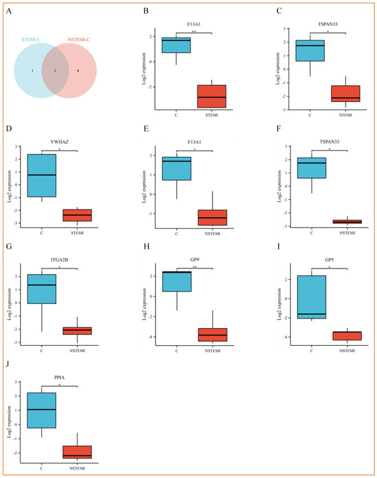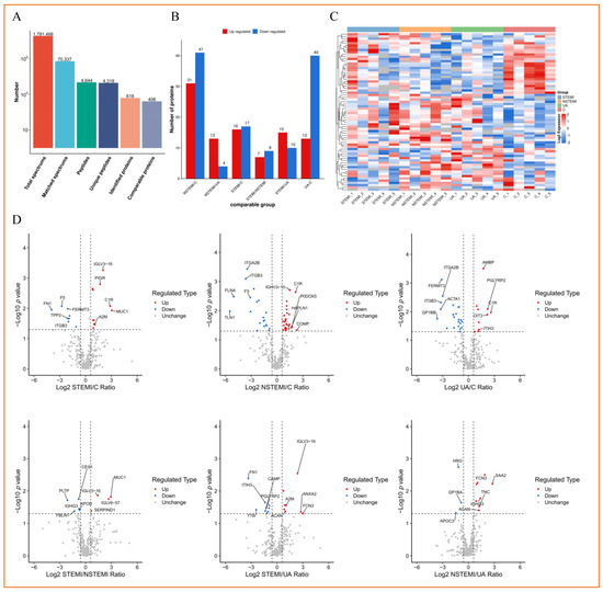 In the discovery phase (STEMI, NSTEMI, UA, CONTROL), a total of 406 comparable proteins (Figure 2A) including 128 exosomal DEPs were identified. Among 128 DEPs, 33 DEPs (16 up, 17 down) between CONTROL and STEMI groups, 72 DEPs (31 up, 41 down) between CONTROL and NSTEMI groups, 52 DEPs (13 up, 40 down) between CONTROL and UA groups, 16 DEPs (7 up, 9 down) between STEMI and NTEMI groups, 25 DEPs (15 up, 10 down) between STEMI and UA groups, 17 DEPs (13 up, 4 down) between NSTEMI and UA groups were identified, respectively (Figure 2B). Figure 2C–F and Supplemental Figure S2A–C show the details of the exosomal DEPs. The up-regulated DEPs included PIGR, AMBP, C1R, and IGKC, and the down-regulated DEPs included F5, FERMT3, YWHAZ, ITGA2B, ITGB3, and F13A1 for the “STEMI-CONTROL” comparison and the “NSTEMI-CONTROL” comparison (Supplemental Figure S2A) or for all the comparisons (Supplemental Figure S2A) were identified. In addition, the heatmaps (Figure 2C and Supplemental Figure S2B) and clustering KEGG enrichment analyses (Supplemental Figure S2C) are shown.