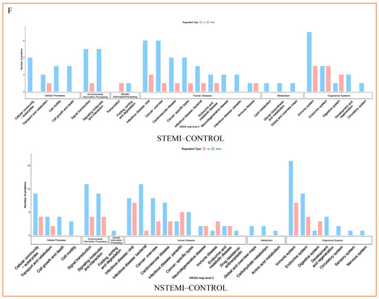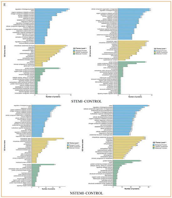 As can be seen from the rose diagram of subcellular classification, the DEPs were mainly located in extracellular and cytoplasm (Supplemental Figure S2D). According to the GO classification bar graph synthesis, for the “STEMI-CONTROL” comparison and the “NSTEMI-CONTROL” comparison, the biological process (BP) that involved the most DEPs were “regulation of biological process” and “cellular component organization or biogenesis”. There were more DEPs distributed in the “intracellular anatomical structure” and “extracellular region” cellular component (CC), mainly involved in the “protein binding” and “protein-containing complex binding” related molecular function (MF) (Figure 2D). More specific results and other comparison results are given in Supplemental Figure S2E and Supplemental Table S3. According to the KEGG pathway classification diagram in Figure 2E and Supplemental Figure S2F, the DEPs were mainly concentrated in the related pathways of human diseases and organic systems, cancer, infectious diseases, cardiovascular disease, the immune system, and the endocrine system.