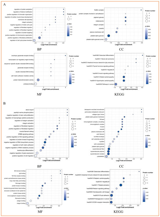 Figure 3A,B and Supplemental Figure S3 are GO enrichment analyses for BP, CC, MF, and KEGG pathway enrichment analysis of DEPs, respectively. Supplemental Table S4 summarizes the GO function and KEGG pathway with the most significant enrichment, the most enrichment, and the greatest enrichment degree of DEPs.