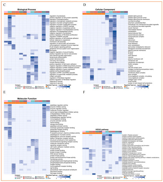 Functional enrichment analysis, cluster analysis, and protein-protein interaction (PPI) network analysis of exosomal DEPs: (A) bubble diagram of Gene Ontology (GO) and KEGG pathway enrichment analysis of DEPs in “STEMI-CONTROL”; (B) bubble diagram of Gene Ontology (GO) and KEGG pathway enrichment analysis of DEPs in “NSTEMI-CONTROL”; (C) cluster heat map of GO-BP; (D) cluster heat map of GO-CC; (E) cluster heat map of GO-MF; (F) cluster heat map of KEGG; (G) PPI analysis of DEPs. [“C” means “CONTROL”, “BP” means “biological process”, “CC” means “cell composition”, “MF” means “molecular function”. For C-F, * p < 0.05, ** p < 0.01, *** p < 0.001. For G, “red” means “up-regulated”, “blue” means “down-regulated”].