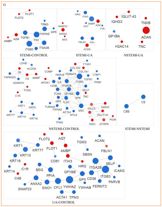 Figure 3G are PPI networks of different comparisons. The hinge proteins with the highest connectivity are ITGB3 and FN1 (STEMI-CONTROL), ITGB3, SRC, ITGA2B, GP1BA, and GP9 (NSTEMI-CONTROL), YWHAZ, and ITGB3 (UA-CONTROL).