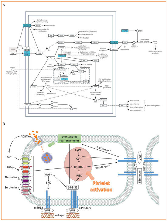 Von Willebrand factor (VWF) mediates the connection between collagen matrix and platelet membrane receptor glycoprotein GPIb-IX-V and locally produces soluble platelet agonists (mainly thrombin, adenosine diphosphate [ADP], and thromboxane A2 [TXA2]). With these effects, the initial activation and adhesion of platelets are initiated, and downstream signals are activated [31,32,33,34,35,36]. This signal reaction includes the increase in cytosolic Ca2+, the rearrangement of the cytoskeleton, the activation of PI3- kinase (PI3K), and the “inside-out” activation of integrin αIIb/β3. After activation, the conformation of αIIb/β3 changes, and through the combination of αIIb/β3 with fibrinogen or VWF, platelet adhesion and aggregation are mediated, and thrombosis is formed [31,32,34,35,36,37]. Subsequently, αIIb/β3 is activated to bind to ligands, and the “outside-in” signal transduction and the interaction with cytoskeleton proteins change, controlling post-adhesion events such as diffusion and contraction [36]. In cells, the GPIb-IX-V complex regulates platelet activation and adhesion under different physiological/pathological backgrounds by chelating 14-3-3ζ signal protein, regulating the binding state of receptor and VWF, and mediating intracellular signal transmission [31,34]. Activated platelets also release aggregation-promoting factors such as ADP, serotonin, and TXA2, and induce the production of secondary messenger diacylglycerol (DAG) and inositol 1,4,5-triphosphate (IP3), this process also leads to the increase in intracellular Ca2+ concentration and further induce platelet activation [31,33]. The increase in cytosolic calcium concentration will also regulate the release of ADP and TXA2; these molecules act as autocrine agonists to activate nearby platelets [31,37]. Platelets initially interact with VWF adsorbed on collagen through GPIb-IX-V, completing irreversible adhesion, and then soluble agonists TXA2 and ADP enhance αIIb/β3-dependent platelet aggregation [36,37]. Figure 5 describes the details of this process.