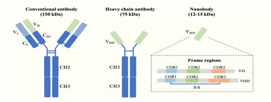 In addition, the frequent presence of a disulfide bond within the CDRs of Nbs originating from camel HCAbs (Figure 1) can significantly enhance the structural rigidity of Nbs, thus conferring exceptional heat resistance and chemical tolerance [23]. Owing to their remarkable stability, Nbs exhibit sustained target-neutralizing activity even after aerosolization and lyophilization, making them a promising inhalable nebulizer for the prevention and treatment of severe air-borne infections [24,25]. Moreover, Nbs possess a higher abundance of hydrophilic amino acids, thereby demonstrating enhanced solubility in aqueous solutions. Nbs can be manufactured on a large scale utilizing easily reproducible expression systems such as Escherichia coli or yeast, at a cost well-below $100 per gram.