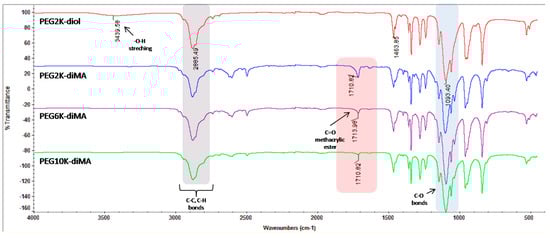 FTIR spectra of the synthesized PEG-diMA polymers and PEG2K-diol.